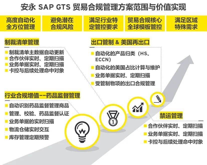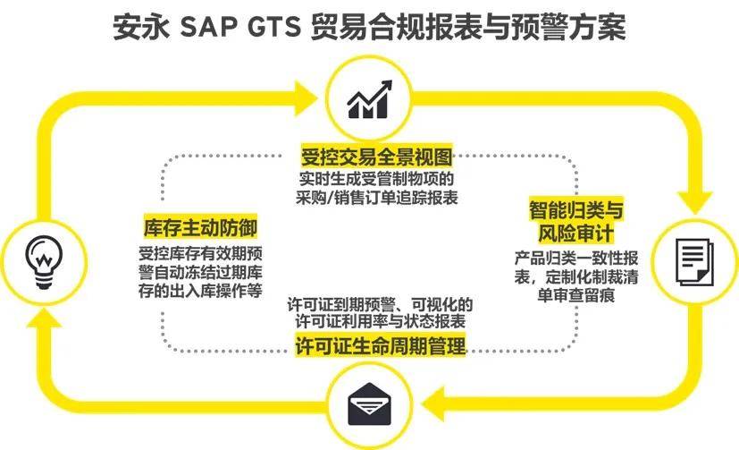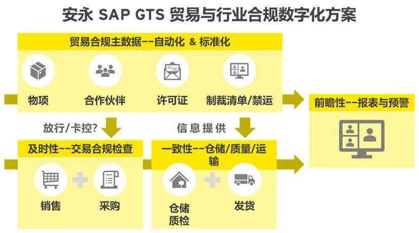 安永为集团A打造的SAP GTS贸易与行业合规管理方案,以标准化、自动化的主数据管理为起点,实时监控交易与物流的合规性,并向企业提供了多维度的预警与报告。